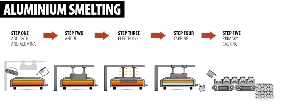 As seen in step two in the above picture, in the traditional smelting process, a carbon anode is placed in a bath that contains alumina and other materials. Then, as step three shows, electrolysis is employed where strong electrical current passes through the bath. This process then produces aluminum.