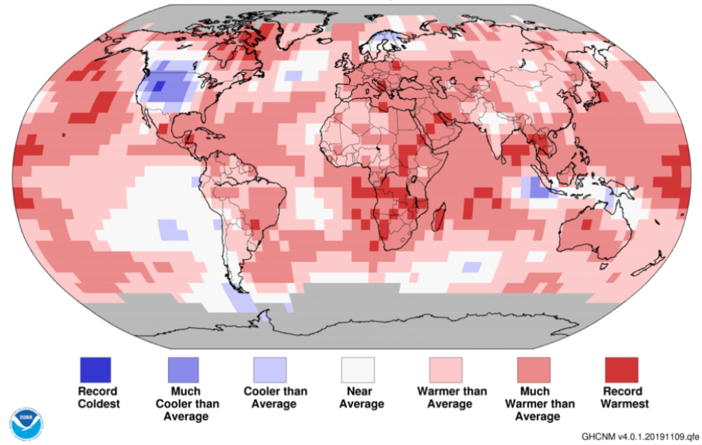 The National Oceanic and Atmospheric Administration (NOAA) says October 2019 was the second-warmest October in its 140 year global database. Moreover, the 2019 year-to-date record was also the second-highest on record for January to October.
