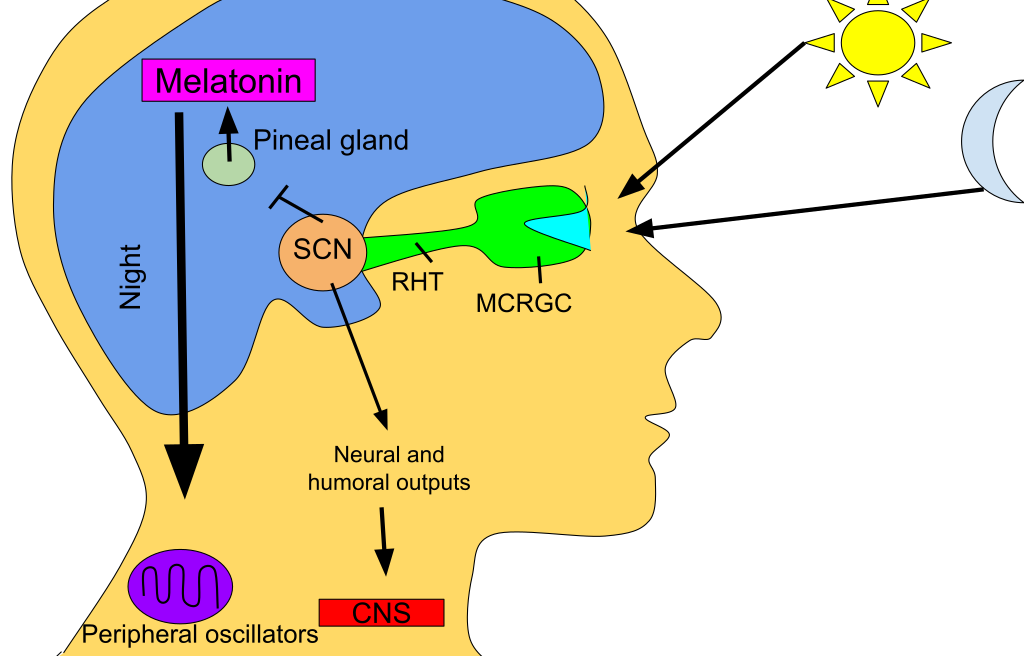 At dawn when the sun rises, the light triggers our eyes. These send a signal to our pineal gland which produces melatonin. The gland ceases making the protein and we become fully awake.