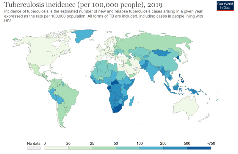 Tuberculosis incidence (per 100,000 people), 2019 (Data World Health Organization / Image Our World in Data)
