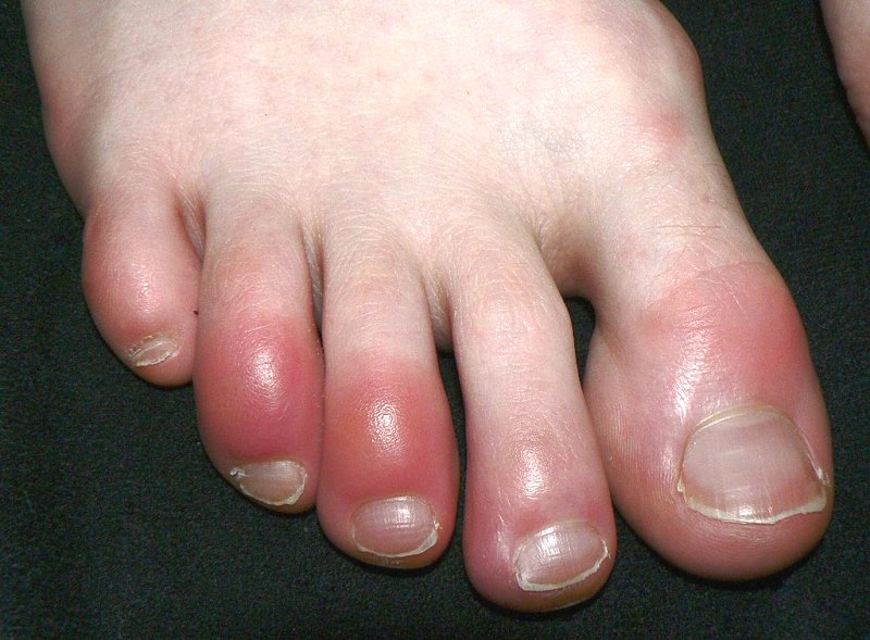 Chilblains are a natural response to cold and humidity, especially among women. Small blood vessels in the skin take strain. This can lead to redness, itching, inflammation, and possibly blisters on hands, fingers, feet and toes. First line treatment involves avoiding cold damp environments, and wearing gloves and warm socks.