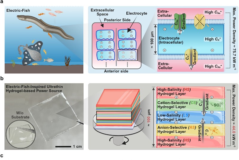 The word ‘hydro’ means water. The flesh of electric eels is moist and can conduct electricity. The Penn State team put two-and-two together, and used multiple layers of hydrogels to achieve the same thing.