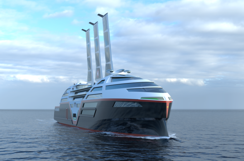 The sails capturing energy from the sun will retract downward when on pure battery power. But they will extend 165 feet upwards to catch free energy from the sky for recharging the batteries.