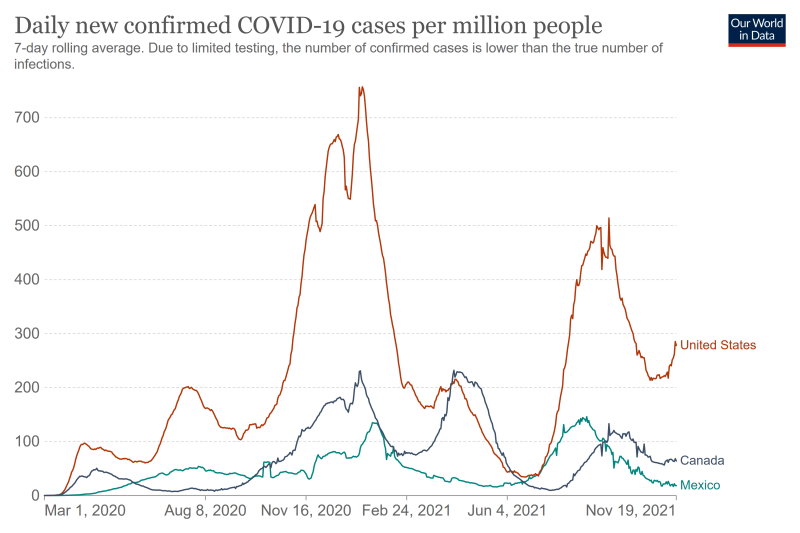 World Health Organization reports two million cases across Europe in the past week. Now European Union population is 445 million, the same order of magnitude as United States. Winter is starting to bite in both parts of the world too, although they each have a fair average vaccination rate.