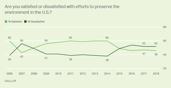 The Gallup poll of July 12, 2019 reports climate change is a talking point among Americans. It found “less than half of Americans (46%) are satisfied with efforts to preserve their environment”. This suggests candidates in the primaries “may have a receptive audience” if they hold similar views their report says.