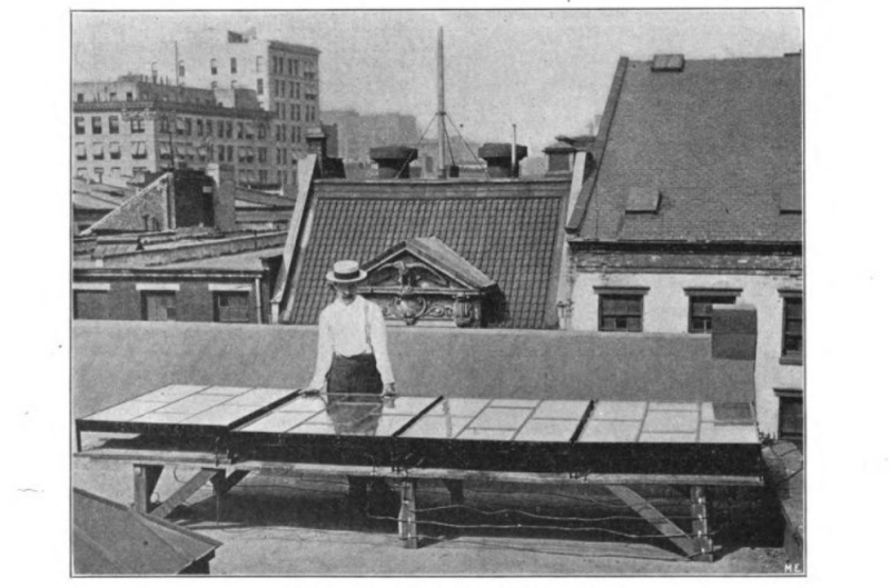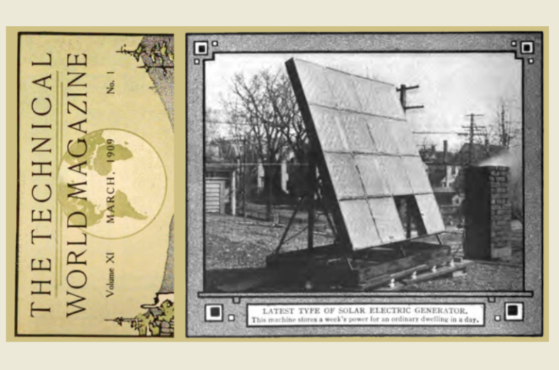 “Given two days’ sun it will store sufficient electrical energy to light an ordinary house for a week… It is as indestructible as a kitchen range… It is possible to store the sun’s rays in any good form of storage battery … And turn them on at will to do the desired work, whether lighting a room or heating a chafing dish or running a sewing machine or churn.”