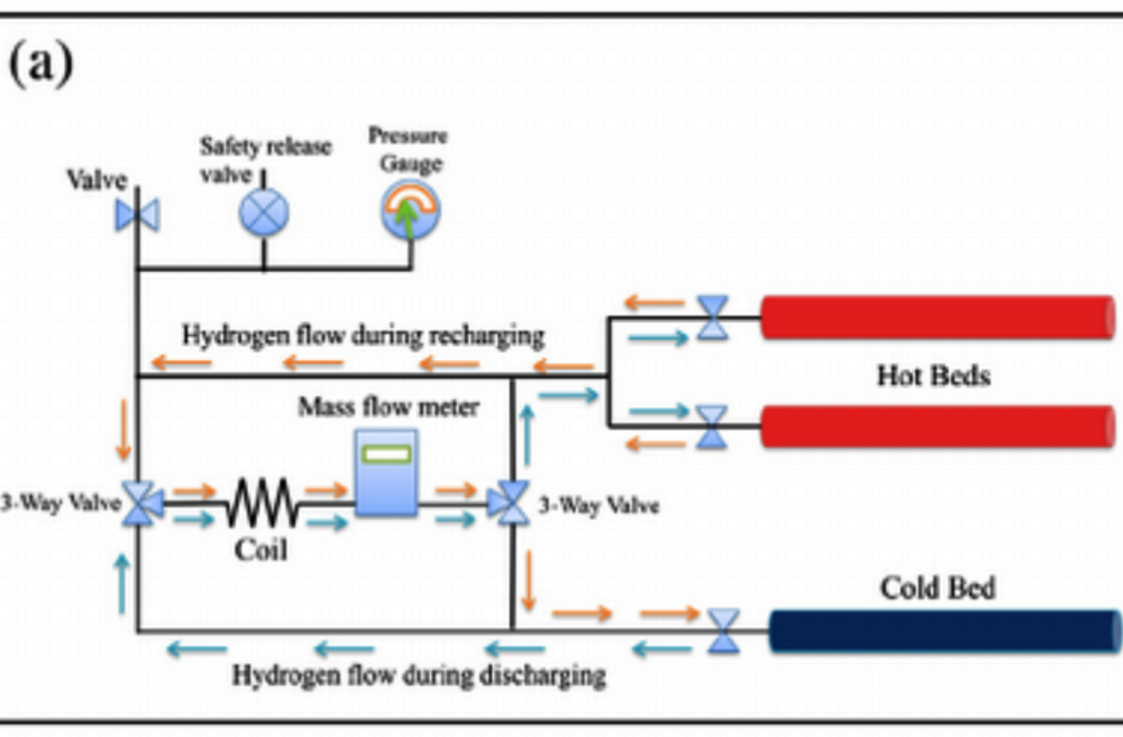 Heat is applied to the high-temperature side at the beginning of the recharging cycle, causing it to absorb hydrogen. Then hydrogen gas takes the thermal energy to the cool side, where it releases with a cooling effect.