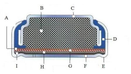 A:Separator, B: zinc powder anode and electrolyte, C: anode can, D: insulator gasket, E: cathode can, F: air hole, G: cathode catalyst and current collector, H:air distribution layer, I: Semi permeable membrane