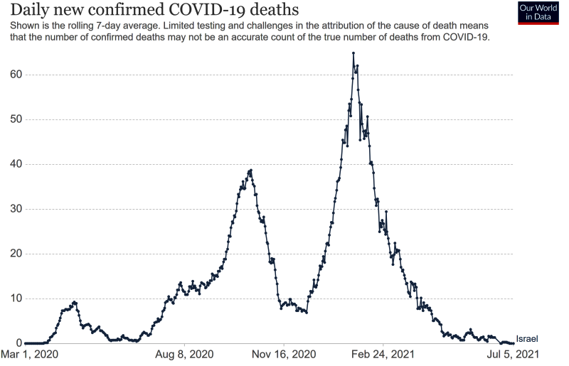 Emerging data from Israel indicates Pfizer-BioNTech’s mRNA vaccine effectiveness declines in the face of Delta. Last week, half Israel’s new cases were vaccinated people suggesting it only prevented two-thirds of symptomatic cases. Although we note the Israeli government only listed two COVID-19 deaths since mid-June 2021.