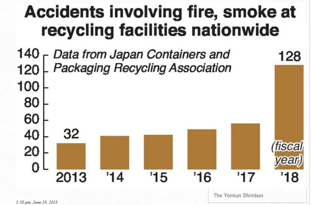 Japanese recyclers are experiencing more lithium battery fires according to a report by the Yomiuri Shimbun news service. Reported battery fires have increased steadily in the past five years. 2019 recorded a shocking 128 by June 10. This is already double the 2018 rate. Recycling plants are burning down and operators have gone out of business. We decided to investigate this because we found it a cause for concern.