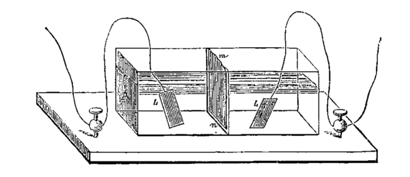 The electrodes at ‘L’ in the above diagram, are the source and the destination of the electrons respectively. We call the source electrode the ‘anode’, and the destination electrode the cathode. These two components are usually different metals, or chemical compounds.
