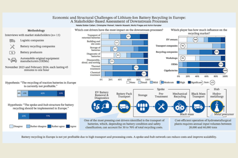 The team from Aachen University in Germany, proposes a decentralized structure. It visualizes ‘regional pre-treatment facilities and centralized chemical processing hubs, to reduce transport distances, lower costs, and improve scalability’ of battery recycling in Europe.
