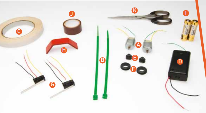 - Attach another double-sided tape on the battery box, next to the green wire. Attach the microswitches. The yellow wires must be in the center while the antennas should be pointing on the sides of your bug robot.