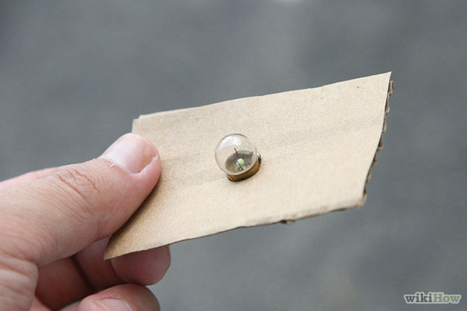 c) Cover the bottom of the bulb with the wire coming from the hole and insert the bulb in to the cardboard strip. Make sure that when the cardboard is taped to the tube, the bulb is in direct contact with the positive terminal of the battery