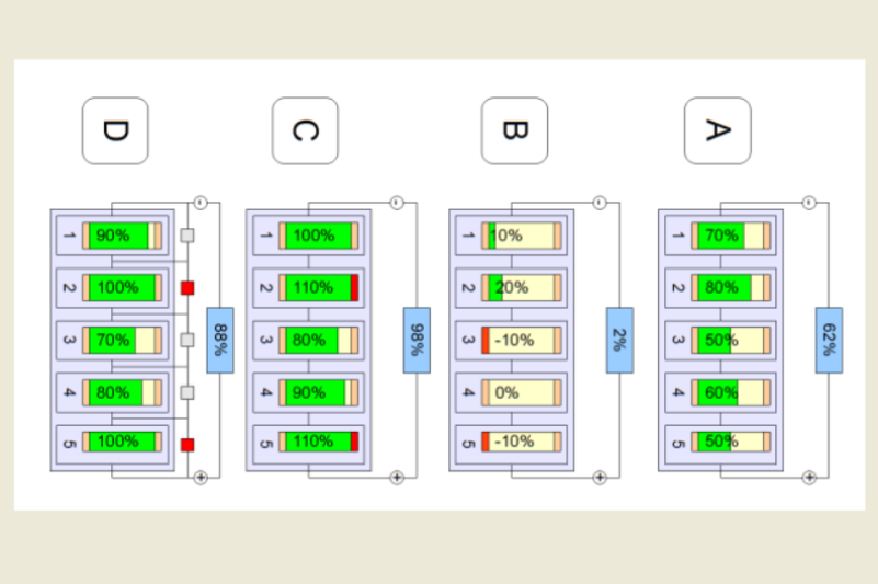 The battery series array determines the overall output of the installation. However, behind the scenes individual cells may be in disarray. If the top cell in a series reaches full charge prematurely, then the ones that follow after it may undercharge by default.