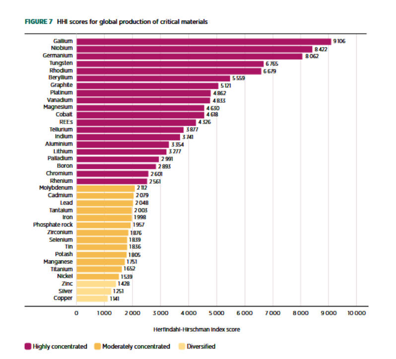 These factors increase our concerns further over future mineral availability, particularly where a longer bar in the graph below represents a more concentrated market for that mineral: