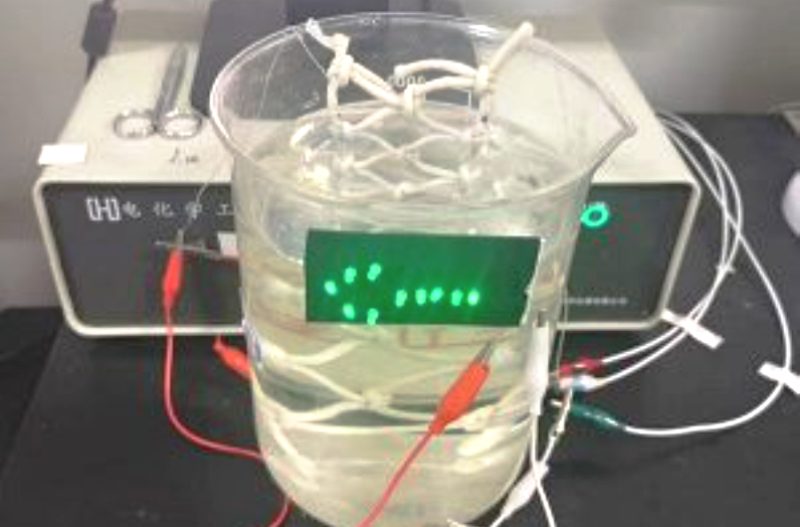 The School of Materials and Energy team first created a ‘yarn-like battery prototype’, that worked when immersed in seawater. And then they knotted the rechargeable strands into a fishing net that illuminated LEDs, before they wove a fabric that also powered a timer.