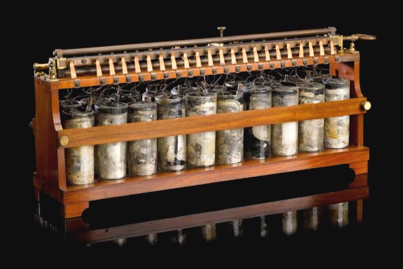 Linda Hall Library explains how Planté assembled 20 separate cells into the 1860 battery at Science Museum in our image. Apparently ‘an elaborate switch at the top allowed the cells to be switched from parallel to series’. Lead batteries were finally making progress, with many familiar elements already in place.