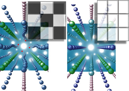 In this case, called nematic order, every space on the checkerboard is red, however, the shapes of the spaces are rectangles, rather than squares. When you turn around on one space, your neighboring space is nearer or farther depending on the direction you are facing.