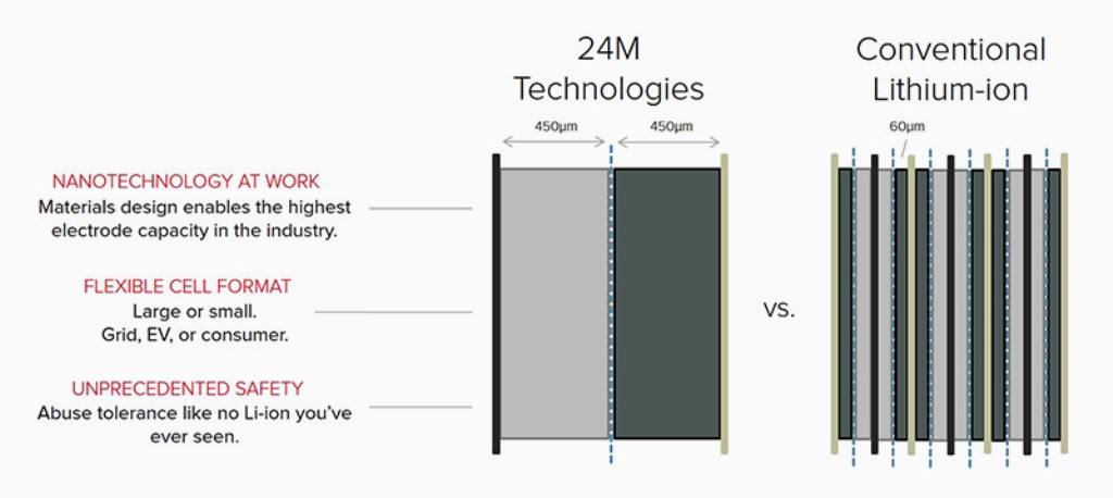 The 24M company says, “the simple truth is that lithium-ion batteries are made the wrong way. This is because the process is cumbersome. It’s wasteful. Moreover, it’s woefully inefficient. 24M’s novel manufacturing process strips out the waste, speeds production and reduces the overall footprint.