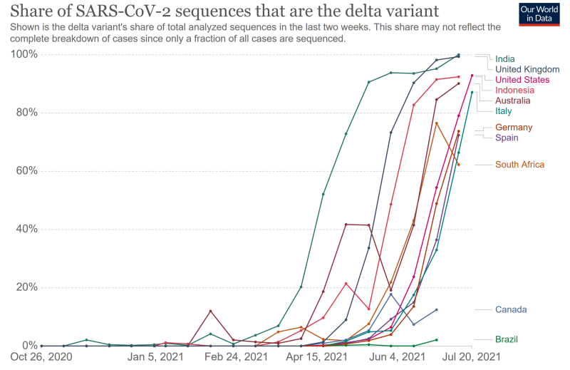 A glance at the above graphic convinces the power of the Delta variant, but there are intriguing exceptions we won’t explore here. The United States is closing on the United Kingdom and India, although the data does derive from targeted testing. This share of Delta variant is a dramatic increase. It’s up from 50% in the U.S. in the week of July 3, CDC director Rochelle Walensky told a Senate committee hearing Tuesday.