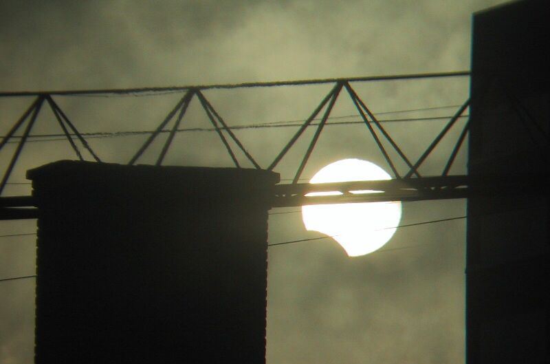 When Moon moves over the sun during a solar eclipse, this shades Earth from Sun’s rays, as surely as that bridge does so in our picture. This reduces the output of solar panels within its range, as surely as they cease producing when the sun sets as night.