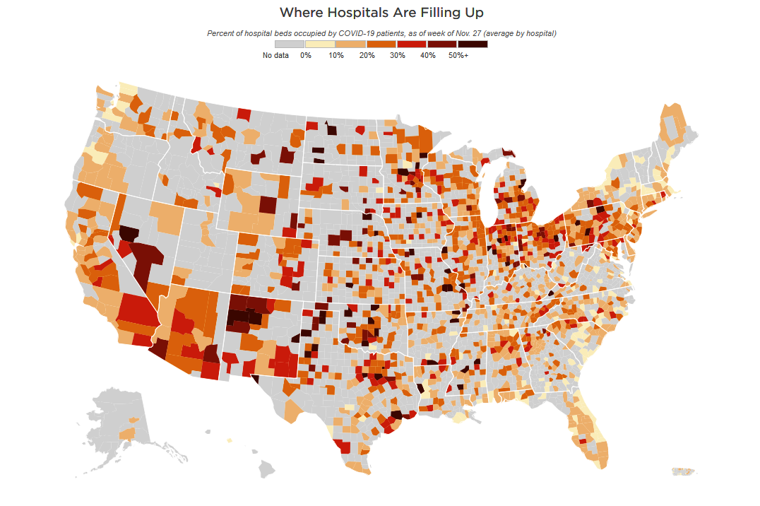 There’s general consensus that when COVID-19 patients occupy more than 10% of beds it’s a warning, according to NPR news. Anything over 20% signifies ‘extreme stress’ for a hospital according to Institute for Health Metrics and Evaluation IHME at University of Washington.