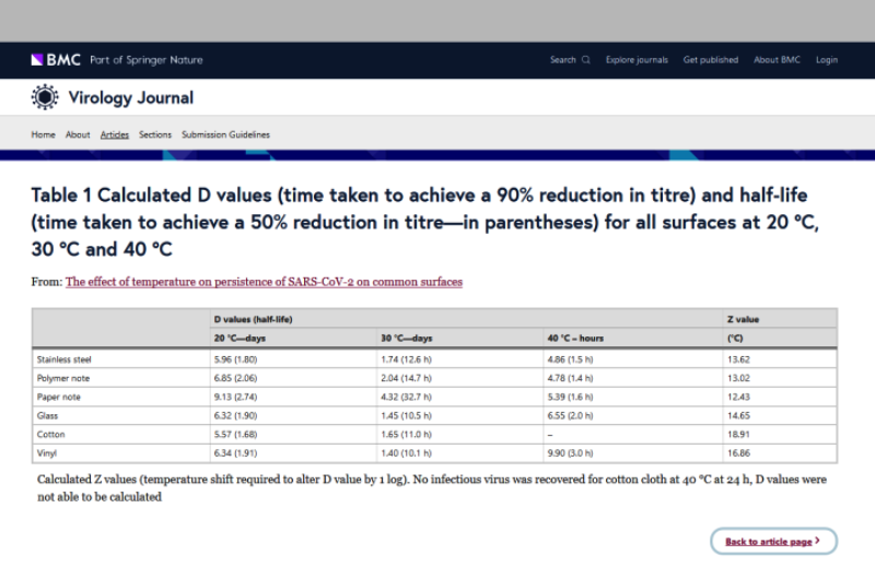 They observed the survival rates of the infectious virus in the liquid matrix at several different ambient temperatures. These were 68 ºF (20 C), 86 ºF (30 C), and 104 ºF (40 C). This is what they found when unpicking the COVID-19 virus survival rate under those conditions.