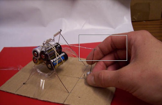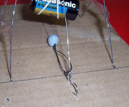 • When assembled, hook the whole thing to the eyelet at the end of the figure 3 paperclip. The ballast should not touch the card base.