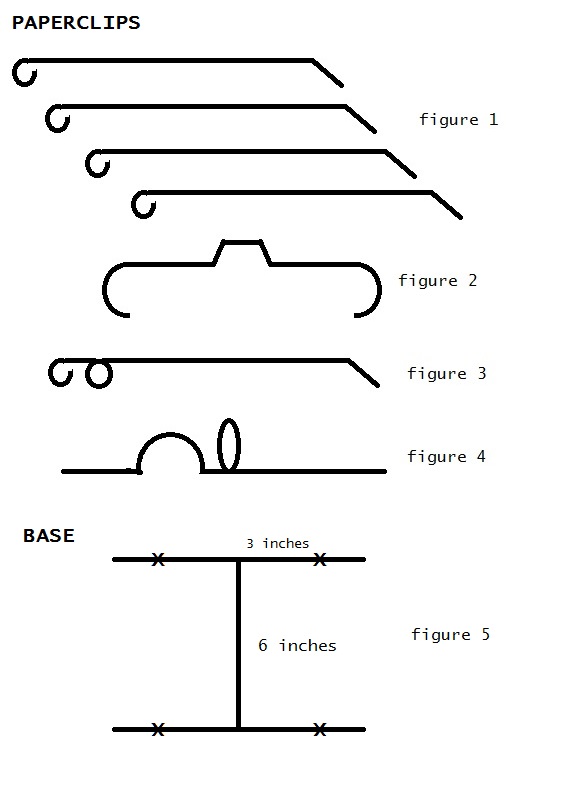 • Get one paper clip and use it to shape the axle. Curve the two ends into hook shapes – about 2” each or wider than the ballast that you will use. Then go to the exact middle and create a U shape. See figure 2.