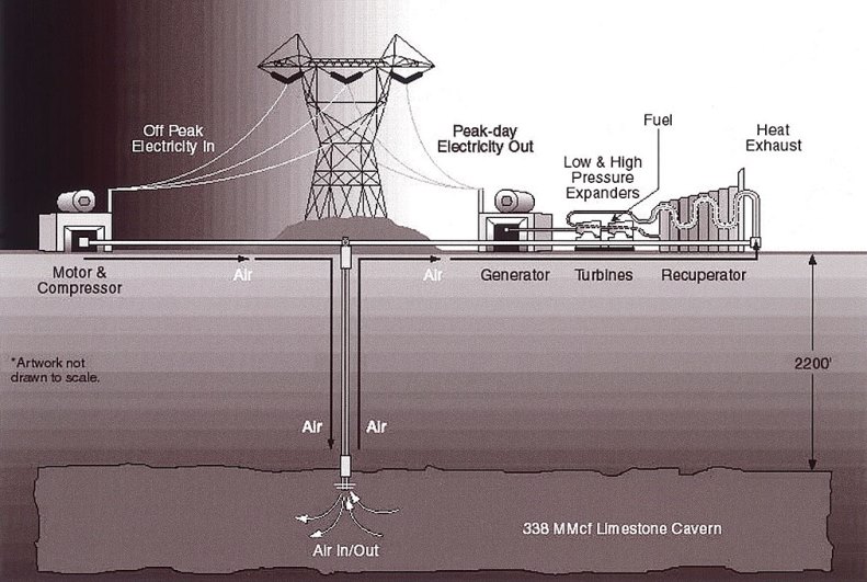 - Compressed-air storage uses something related, except this time the storage medium is compressed air in underground caverns. A pilot plant has operated in Germany since 1978.