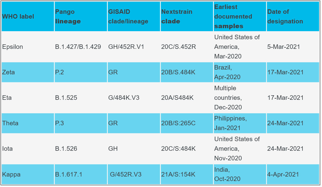 The following variants of interest cause community transmission / multiple COVID-19 cases / clusters, or have been detected in multiple countries. Alternatively, the WHO SARS-CoV-2 Virus Evolution Working Group may have nominated them.